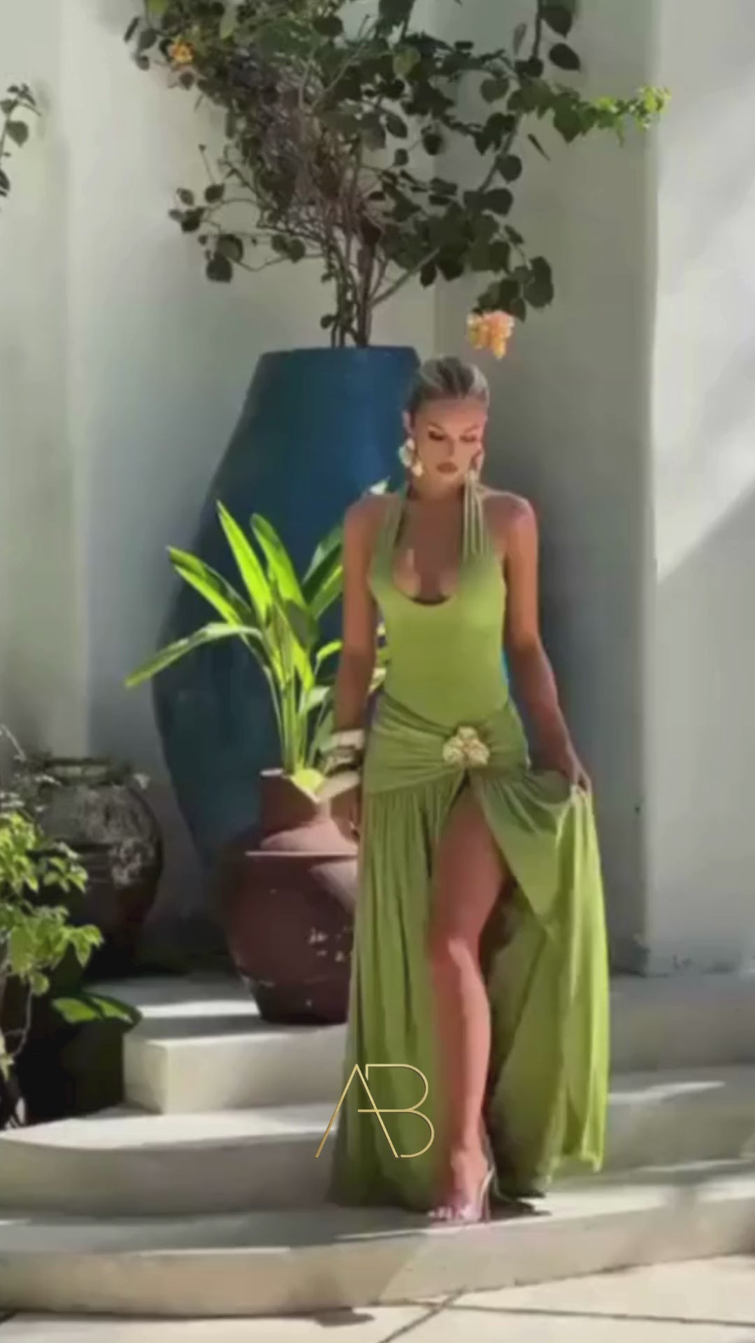 Abito con spacco su lato sinistro con dettaglio in oro in vita.