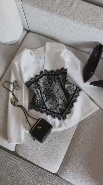 • Design Bicolore: Una base bianco ottico pura o nera, interrotta da un audace inserto centrale in pregiato pizzo con motivo floreale.