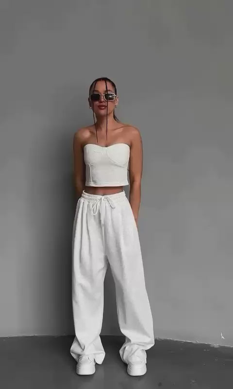 Rinnova il tuo look casual con questo coordinato versatile e alla moda. Il completo comprende un pantalone a palazzo in morbido tessuto di tuta, ideale per garantire comfort senza rinunciare allo stile, e un top con coppette che permette di creare look differenti in un attimo. La felpa corta da sopra completa il set, aggiungendo un tocco streetwear e moderno, perfetta da abbinare sia al pantalone coordinato sia ad altri capi del tuo guardaroba.