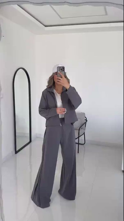 Un outfit raffinato e versatile, perfetto per ogni occasione. Il pantalone a palazzo dalla linea fluida slancia la figura con eleganza e garantisce comfort grazie al tessuto leggero e morbido al tatto. La giacca corta, con chiusura a zip frontale, aggiunge un tocco moderno e dinamico al look, bilanciando alla perfezione il volume del pantalone.