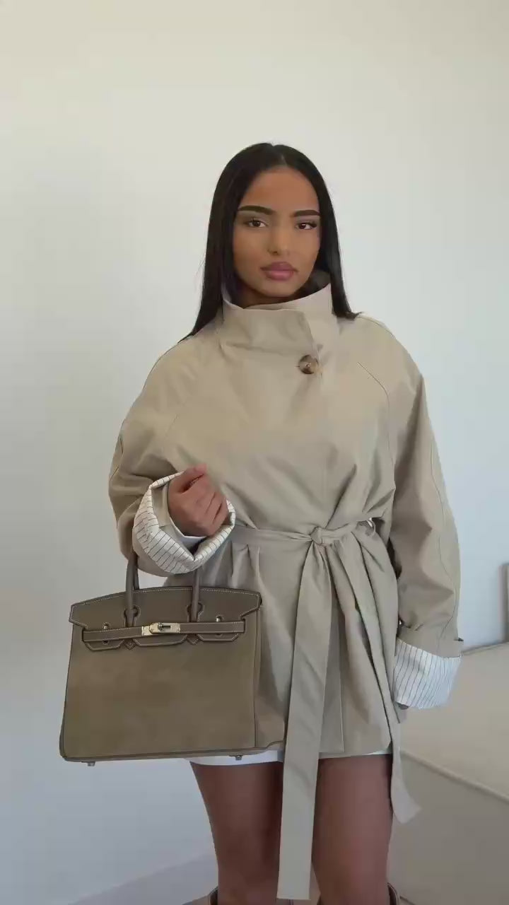 Il collo alto strutturato e la chiusura a bottone singolo creano una silhouette sofisticata, mentre la cintura in vita permette di modulare la vestibilità, passando da un look rilassato a uno più definito e femminile. Il dettaglio a contrasto sui polsini risvoltati aggiunge un tocco di sartorialità inaspettato.