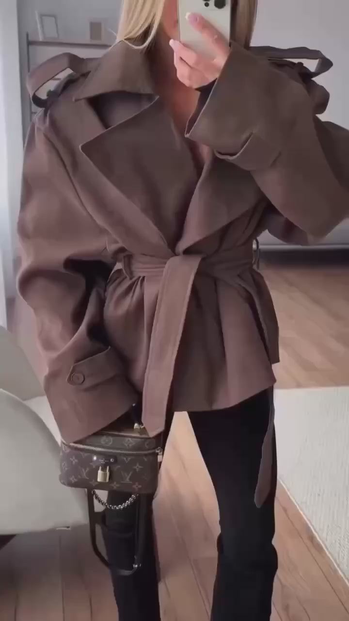 Presenta un ampio colletto, maniche con dettagli a linguetta e cintura coordinata che valorizza il punto vita. La vestibilità leggermente over dona un tocco casual-chic, perfetto da abbinare sia con pantaloni eleganti che con jeans per un look versatile e di tendenza